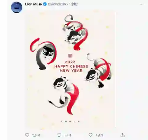 【马斯克发图拜年,水墨老虎搭中国红】1月31日,特斯拉首席执行官埃隆·马斯克在微博及推特上同时发布一张图片,图中4只水墨老虎被点缀喜庆的“中国红”。图片中央则用英文写着“农历新年快乐”。在推特留言板中,外国网友齐刷刷回复:“虎年快乐”“农历新年快乐!”(海外网)