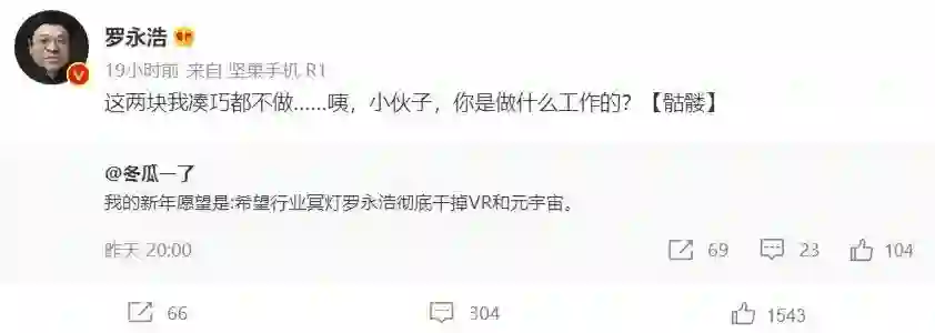 【罗永浩:不做VR和元宇宙】1月31日罗永浩在微博回应网友时表示,VR和元宇宙“这两块我凑巧都不做”。此前罗永浩称年后回归科技界,并称“下一代平台上见”,引起网友热议。(金融界)