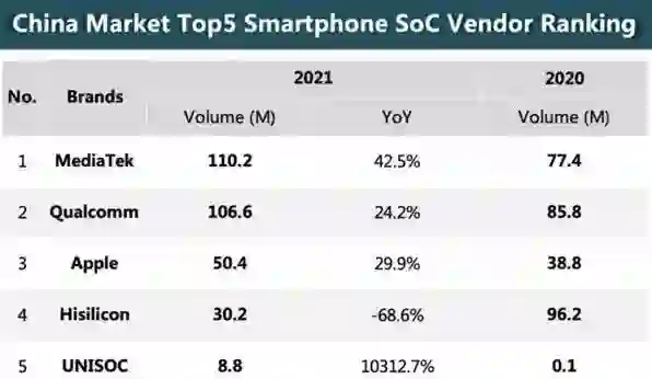 【2021年国内手机SOC销量榜:联发科登顶】近日,统计机构CINNO Research公布了201年中国智能手机市场SOC销量榜。榜单前五分别为联发科、高通、苹果、海思和紫光展锐。其中,联发科全年出货量达1.1亿颗,同比增长42.5%。海思出货3020万颗,同比下降68.6%。(快科技)