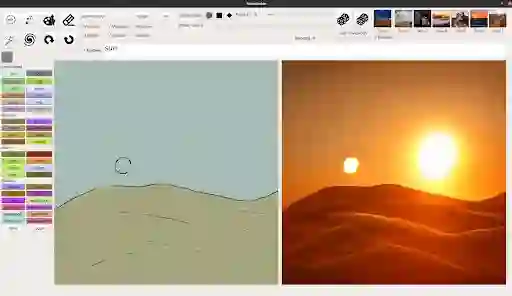 例如星球大战系列中塔图因星有两个太阳。借助 GauGAN2 只需输入文本「desert hills sun」来创建一个起点,之后用户可在已有一个太阳的情况下快速绘制草图,生成想要的效果。