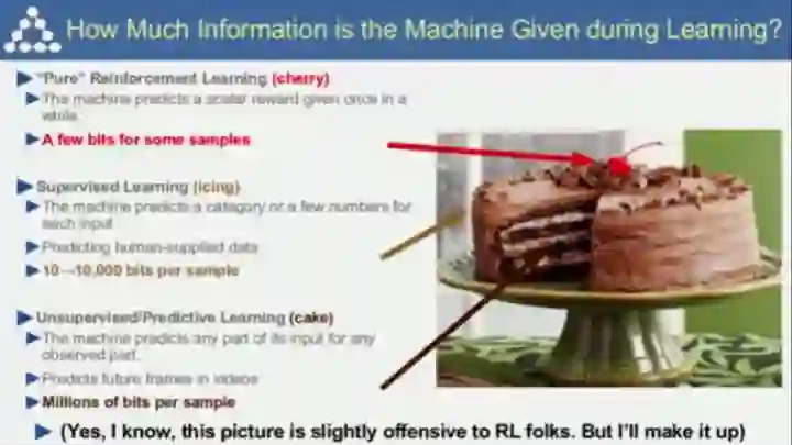 然后Lecun展示了他著名的“蛋糕”理论。“真正的”强化学习好比蛋糕上的樱桃,监督学习好比蛋糕上的糖衣,而蛋糕本身是非监督学习(预测学习)。这里Lecun也表示,这一比喻对做强化学习的兄弟可能不太友好——“Because the cherry is not optional”。