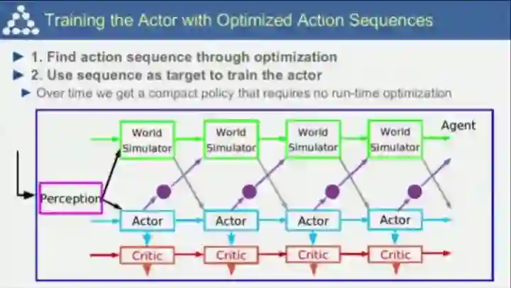 对应的迭代式的学习方式和优化如上图所示。这种非监督学习方式也是人类诸如学开车等技能获得的重要方式,因为人们会推演行为带来的后果,并不断调整达到最优。
