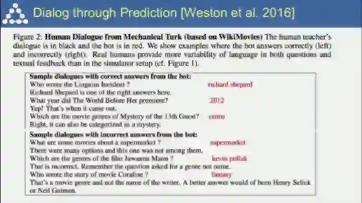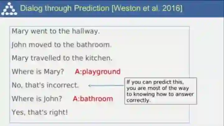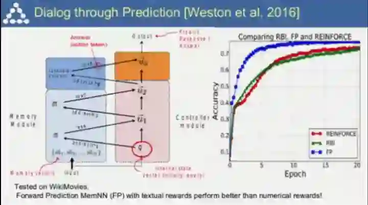 端到端的记忆网络。你之前告诉机器的东西会被储存起来,并在之后询问提及时被激活,这一方式可以用于构建对话系统,而且对话系统和机器人与世界进行交互的过程有着诸多相似之处;