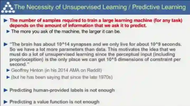 为什么下需要进一步发展非监督学习?这是由于用于训练一个大的学习机器的必要样本量取决于我们要求它能预测多少信息,你对机器要求越多,所需要的数据也越多。在人类大脑中有10^14个神经元触突,而人的一生大概有10^9秒,这意味着在人类大脑这个系统中参数远远大于数据量,而机器想要赶上人类,必须模仿人类的非监督学习方式。