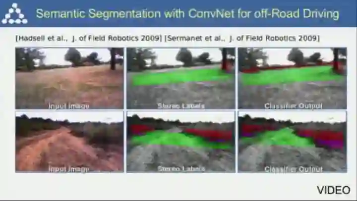 若干年后的另一个研究,将视频中的场景识别为不同种类,如道路、汽车、建筑等。当时还缺乏对应的数据集,需要进行大量的标注。由于缺乏数据,这并不是卷积神经网络的强项,只是相比其他方法来说算是一个不错的选择而已(直到2012年ImageNet上的突破)。