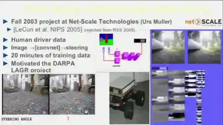 而在Lecun将机器学习应用于机器人的研究在2003年,当时DARPA找到Lecun,通过模仿学习进行避障的研究。2005年,Lecun将论文投给了第一届RSS(机器人领域的顶级学术会议之一),但很不幸的被拒了,随后Lecun将论文转投当年的NIPS,论文被收录发表。而这一研究的阶段性成果也打动了DARPA,并催生了之后的DARPA LAGR项目(这么说来,Lecun在机器人方面的研究天赋是不是被RSS耽误了呢)。