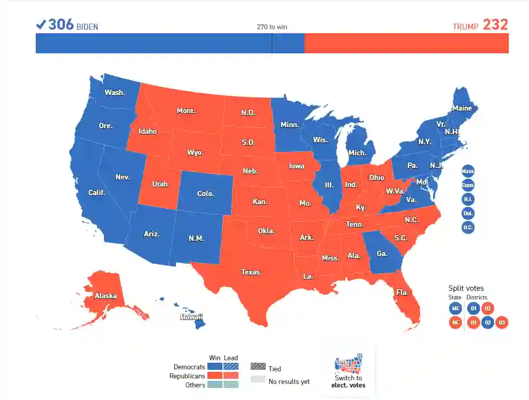 如果细看选票的统计的话,会发现,从全美普选票来看,在计票率为97%时,拜登以50.8%的得票率超过特朗普的47.4%,拜登的优势并不是特别大。