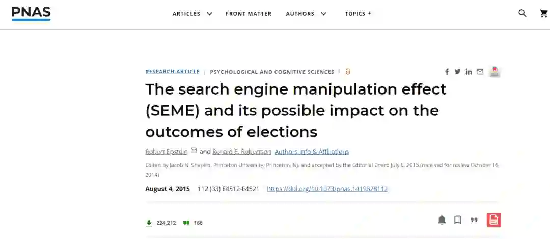 2015年8月,美国行为研究与技术学会的高级研究心理学家Robert Epstein就指出,通过「带有偏见的搜索结果」,谷歌可以影响了犹豫不决的选民。
