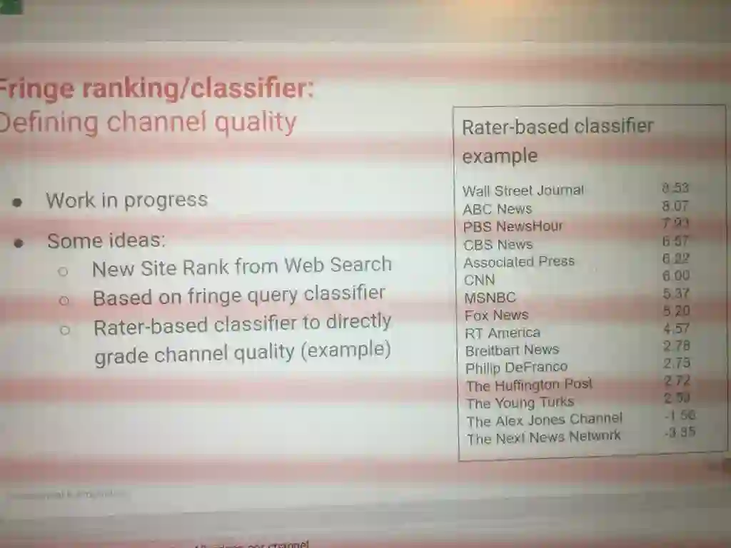 在一份被泄露的题为「边缘排名/分类器: 定义频道质量」的文件中,谷歌将ABC、CBS和CNN评为比福克斯新闻、《今日俄罗斯》和Breitbart更权威的媒体。