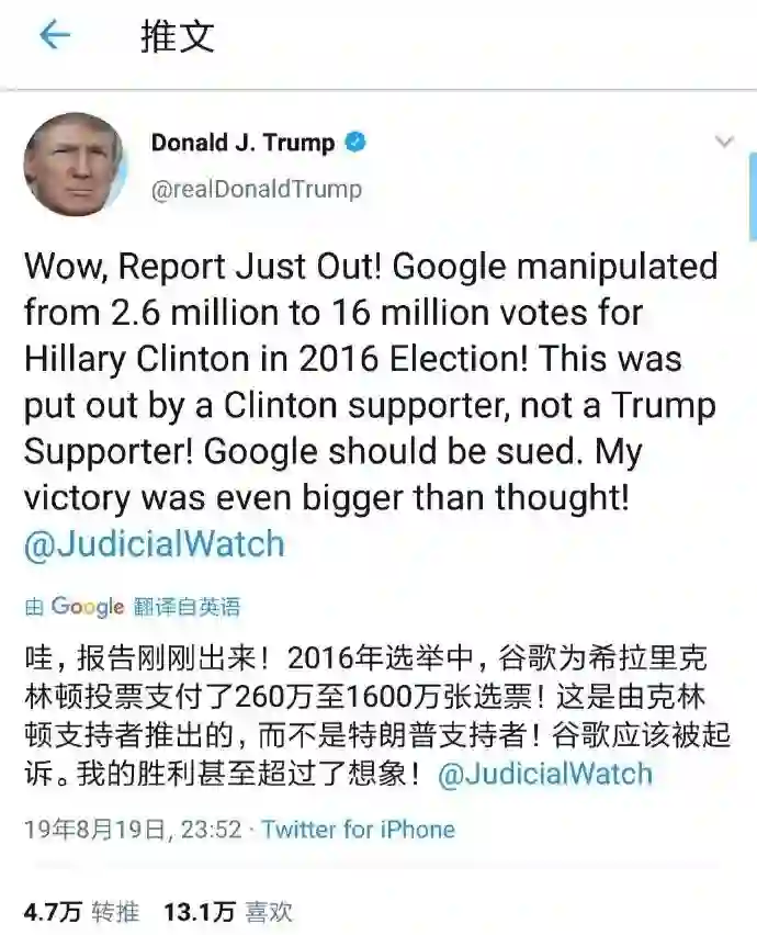 到了2019年,特朗普引用一个「报告」,发推指责谷歌在2016年美国总统大选时「操纵260万到1600万选票支持希拉里」。