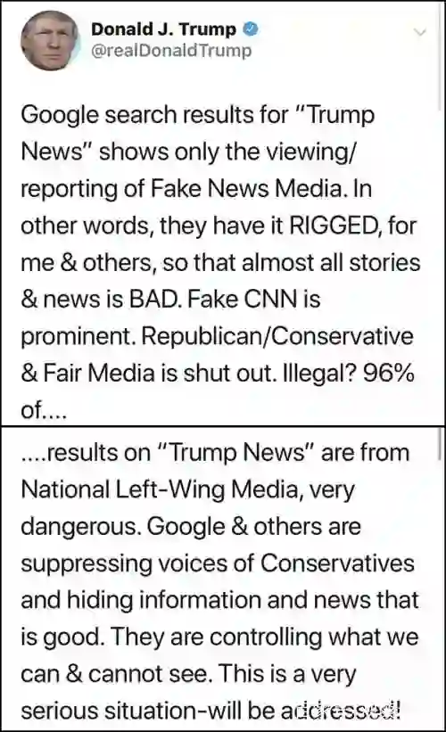 例如,2018年举行的中期选举时,特朗普推特上发言称「在谷歌上搜索特朗普新闻时,出来的全是假新闻……谷歌和其他媒体都在压制保守派的声音,将正面新闻隐藏起来。这些科技公司正在控制人们可以看什么,不能看什么。」