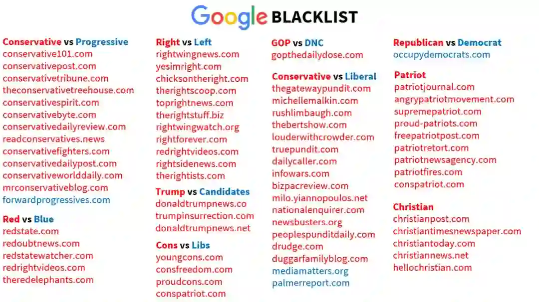 在这个特别的黑名单中,显示了数百个在安卓的新闻搜索结果中被审查的保守派网站,存在明显的政治偏见。