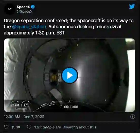 当这个太空舱到达空间站,它将是第二个附着在国际空间站的「Dragon」号太空舱。11月15日,SpaceX曾使用「Dragon」号太空舱发射了一个四人小组至空间站。一天后,该太空舱与空间站对接。
