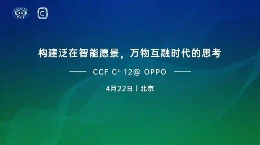 CCF C³第十二期主题是:构建泛在智能愿景,万物互融时代的思考,将于4月22日周五晚(18:30-21:30)在OPPO北京举行。