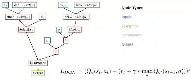 受 NAS 概念(搜索表示神经网络架构的图表空间)的启发,我们通过将 RL 算法的损失函数表示为计算图来元学习 RL 算法。在这种情况下,我们使用一个有向无环图表示损失函数,用节点表示输入、运算符、参数和输出。例如,在 DQN 的计算图中,输入节点包括重放缓冲区的数据,操作节点包括神经网络运算符和基本数学运算符,输出节点代表损失,可利用梯度下降算法达到最小值。