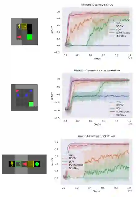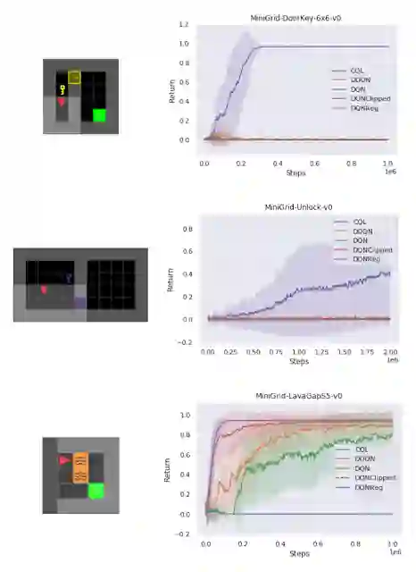 我们在一些 MiniGrid 环境中将标准 DDQN 与习得算法 DQNReg 的性能进行可视化比较。这些环境的起始位置、墙壁配置和对象配置在每次重置时都是随机选取的,这要求代理进行泛化,而不是简单地记忆环境信息。通常,当 DDQN 还在艰难地学习有意义的行为时,DQNReg 已经能够有效地学习最优行为了。