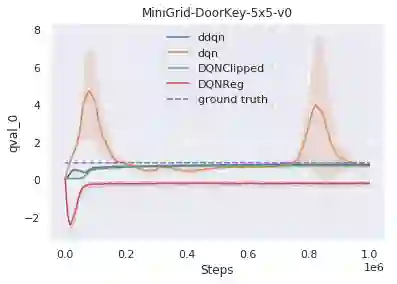 一项更深入的分析显示,虽然 DQN 等基线通常会高估 Q 值,但我们的习得算法都以不同的方式解决这一问题。DQNReg 会低估 Q 值,而 DQNClipped 的做法则类似于 double dqn,它会缓慢地接近基本事实,而不是高估它。
