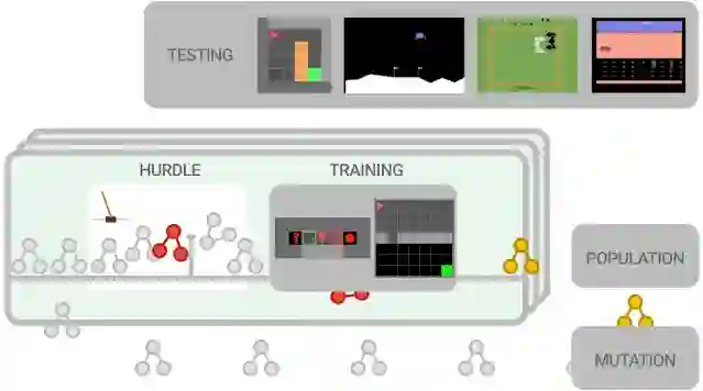 如果一个代理不能解决障碍环境,训练就会提前终止,得分为零。否则,继续提升训练环境的难度(例如,Lunar Lander、简单的 MiniGrid 环境等)。评估算法性能,并用来更新所有代理,在此过程中进一步演变出更出色的算法。为减少搜索空间,我们使用一个功能等价性检查工具,它将跳过功能和已查算法相同的新提出的算法。这个循环不断继续,不断训练和评估从中演化出的新算法。训练结束后,选择最好的算法,并在一组未知的测试环境中评估其性能。