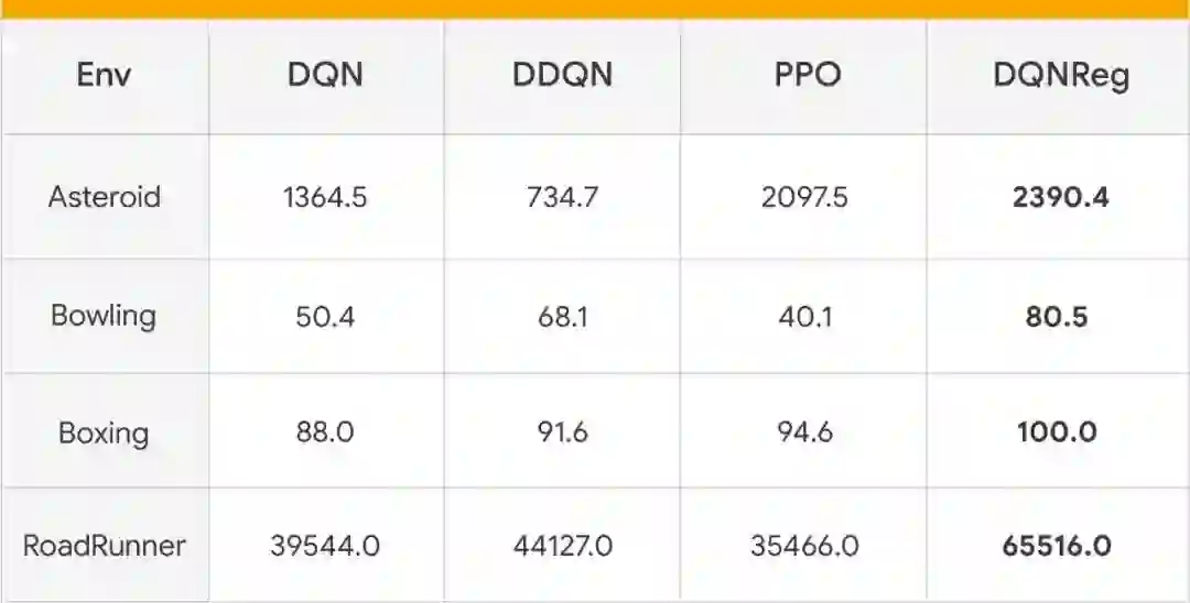 在若干雅达利游戏中,习得算法 DQNReg 的性能与基线的比较。每经过 100 万步,就有超过 200 个测试集接受性能评估