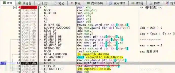 由于在调试漏洞前并没有找到该漏洞的 POC,所以需要手动的构造数据并且完成分析。幸运的是从阅读国外的几篇分析文档中捕获到了两个重要的信息,第一个是漏洞触发的函数为 sub_443F6C,且存在复制操作的指令为 mov [ecx],al。
