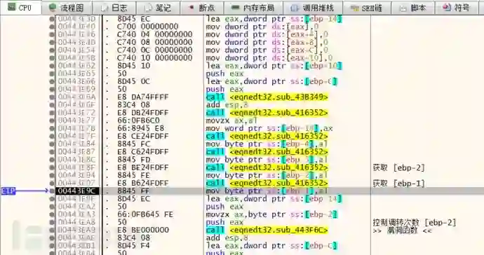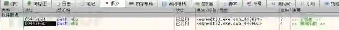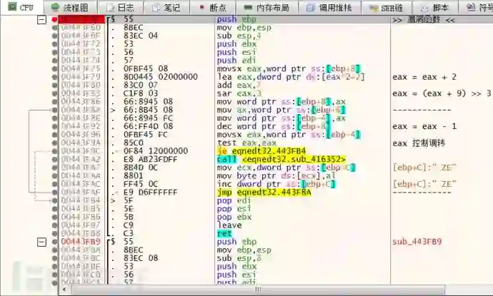 重新运行之后断在了 sub_443F6C 函数上,通过分析堆栈调用,发现其父函数为 sub_443E34,对这两个函数下记录断点,看看该函数与解析矩阵数据是否有关联。从下图中可以看出当只有一个矩阵公式时 sub_443E34 执行了一次。