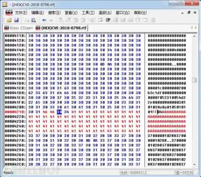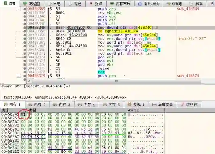 新建 RTF 文件,插入一个带有矩阵公式的公式编辑器对象(OLE),之后在 sub_443F6C 函数的首地址下断点,看看处理 Matrix 数据时是否走 sub_443F6C 函数这个流程。