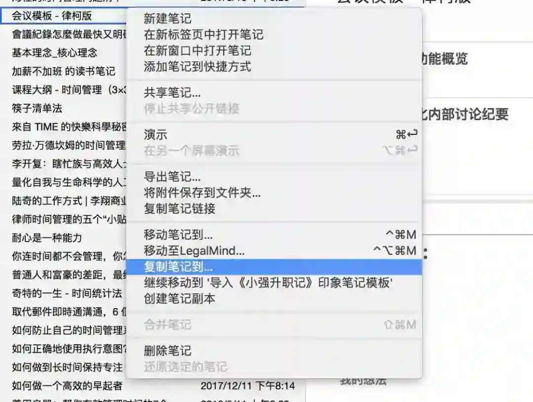 第一种是「复制笔记到…」,在笔记上右键,点击并选择目标位置。