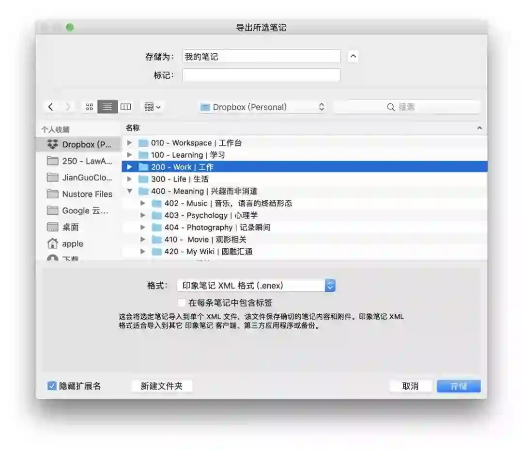 如果是 1 对多的分享方式,比如你给 100 个人上课,或者写了一篇文章想要给读者分享一个模板,那么我建议采用导出导入 ENEX 文件的方式,操作也非常简单,只需要 文件 - 导出笔记,选择「enex」的格式即可,把这个文件上传到网盘提供给大家下载链接,体验非常好。