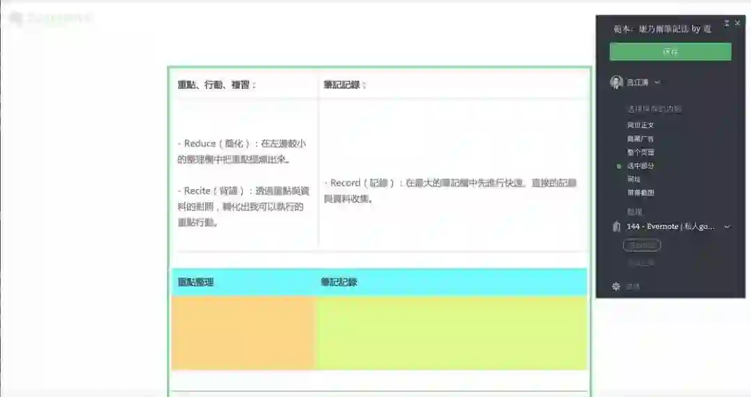 受 Evernote 国际版和印象笔记的账号体系的限制,上面这个模板不能直接点击页面右上角的「保存到 Evernote」。不过解决方法非常简单,你可以使用印象笔记的剪藏功能或者干脆直接选中复制页面的内容,粘贴到笔记中,两种方法都可以在 10 几秒内解决问题。