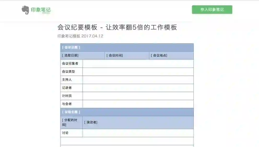 可千万别小瞧了这个「大表格」,一个优秀的模板背后一定渗透着卓越的思维方式、反复的流程优化,就像一个融汇了万千智慧的压缩包。最关键的是,你可以以模板为基础,自我定制和持续更新,配合自己的需求打造专属系统。作为印象笔记的用户,第一件事情就是将其改造成印象笔记的版本,同步世界 500 强企业的开会流程啦。