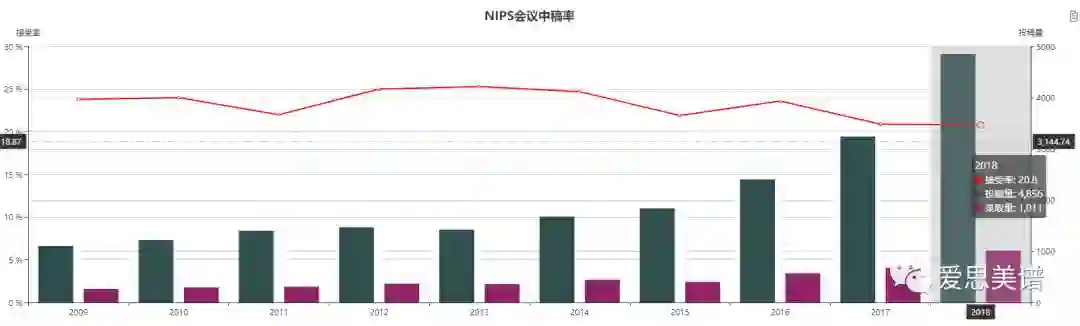 其中,绿色为投稿量,紫色为中稿量,曲线代表接受率。我们可以看到,2018年投稿量为4856,远大于2017年的3240和2016年的2403。