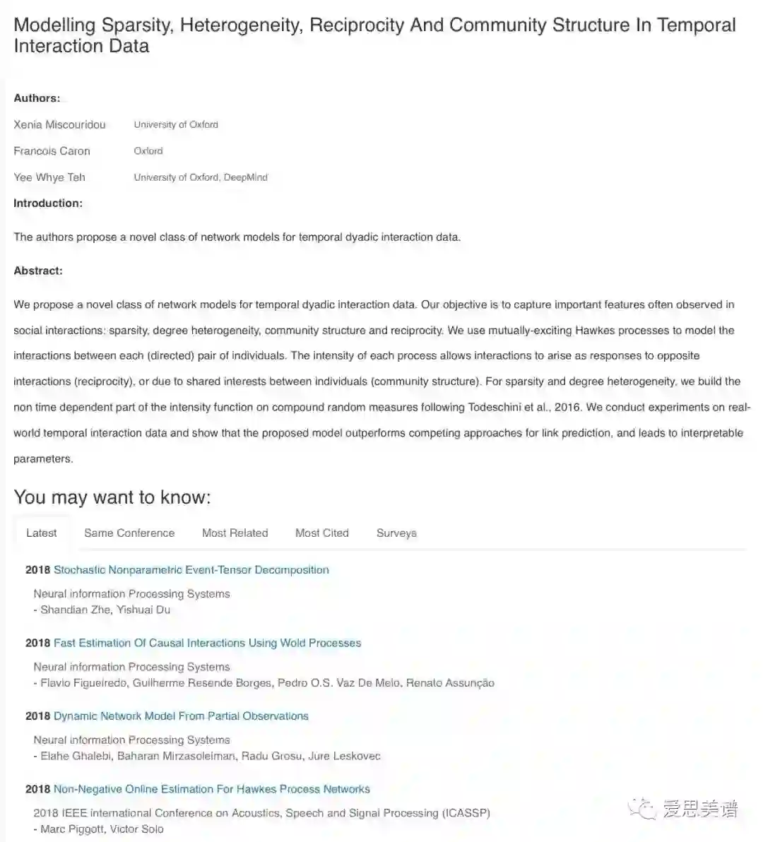 我们从五个维度对每篇论文进行了相似论文推荐,形成论文推荐矩阵。这些维度包括最新、同会议、最相关、被引用数最多和导读类论文,这种多维度推荐能够满足不同用户的不同需求。AceMap针对NeurIPS 2018各篇论文的相似论文推荐页面如下如所示: