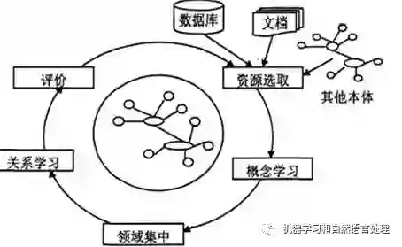 (1)资源选取:这是环形的起点,是一个通用的核心本体的选择。任何大型的通用本体(像Cyc、Dahlgren的本体)、词汇-语义网(像WordNet,GermaNet)、或者领域相关的本体(像TOVE)都可以作为这个过程的开始。选定基础本体后,用户必须确定用于抽取领域相关实体的文本。