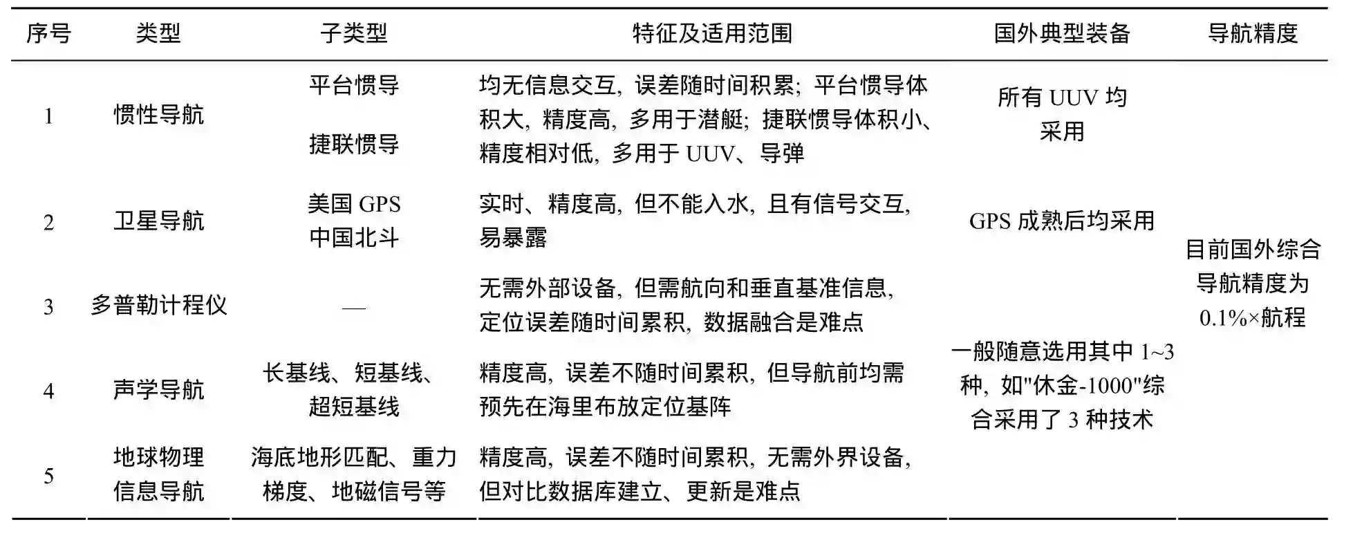 UUV的导航系统受大小、重量、电源使用的限制及水介质的特殊性、隐蔽性等因素影响,实现精确导航难度较大。现有产品多综合使用惯性导航、卫星导航、多普勒计程仪及声学导航等技术,其性能对比见表4。