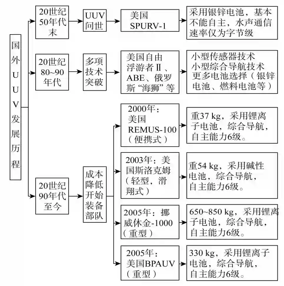 UUV的研制最早始于20世纪50年代末,主要用于海洋科学研究。20世纪70年代,UUV常通过遥控方式被用来执行搜探失事潜艇、反水雷等军事任务。20世纪 80~90年代,随着小型化组合导航、远程水下通信、小型低能耗计算机等技术的突破,UUV开始具备半自主控制能力,但由于成本高,未正式列装。到20世纪90年代末,随着技术的进一步成熟,UUV在民用领域得到了广泛应用,并借助成熟商用技术使其成本明显降低,逐步出现具备反水雷等功能的 UUV并装备部队[2]。