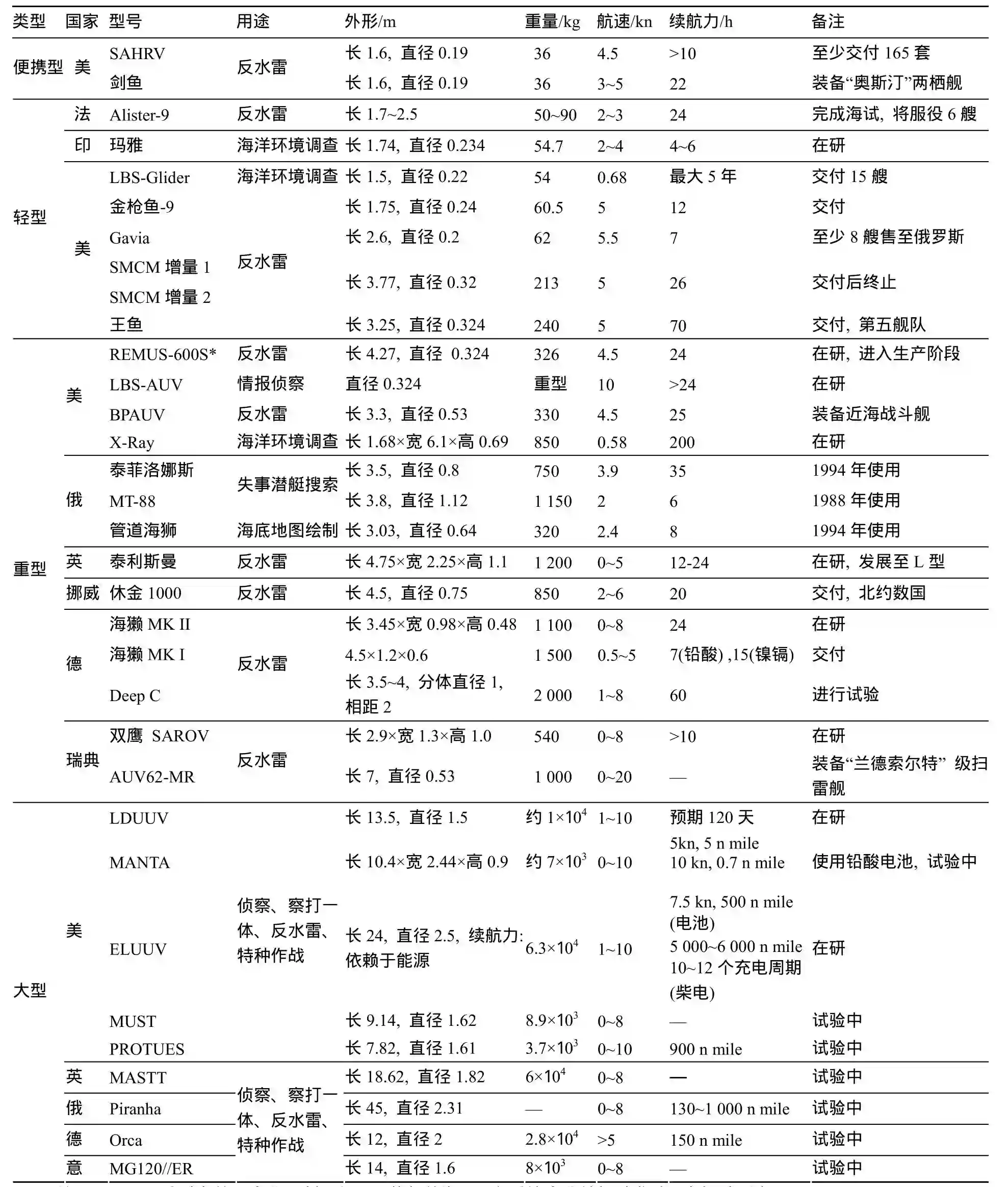 主要海军国家典型 UUV装备体系及主要技术指标分别见图3和表1。