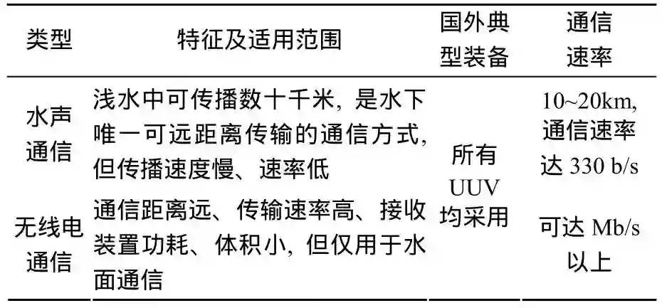 UUV在执行任务时,相互间、与母艇(舰)以及支援平台间需要传输大量的指令和数据,对通信能力提出了较高要求。目前用于 UUV的通信技术主要有水声通信和无线电通信,见表 5。其中: 无线电通信是 UUV在水面采用的主要方式;水声通信是 UUV在很长时间内都将采用的水下通信方式,目前该技术发展已较为成熟,国外很多机构都已研制出小型化的水声通信调制解调器,并在UUV上使用。如美国“金枪鱼”和RUMUS系列 UUV均采用伍兹·霍尔海洋研究所研制的低功耗水声通信系统,传输速率为80~5 400 b/s[16]。