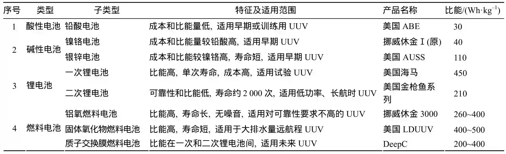 由于工作环境特殊,UUV的能源应满足比能量高、能量密度大、安全性好、可靠性高、易控制、价格低廉、耐低温、耐高压、耐腐蚀且环境污染小(无环境污染)等条件。电池具有结构简单、可承压、无振动与噪声、可靠性高、工作温度范围宽、使用成本低等优点,是绝大部分电力推进型军用UUV的能源。UUV常用的电池主要有铅酸电池、镍镉电池、银锌电池和锂/锂离子电池系列以及燃料电池(见表2)。铅酸电池、镍镉电池和银锌电池主要用于国外早期UUV,前两者因比能量和能量密度低,后者因寿命短,已被锂/锂离子电池取代。