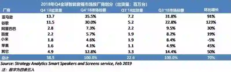 根据市场调研公司Strategy Analytics最新公布的全球智能音箱2018年Q4出货量报告,阿里、百度和小米已然跻身前五名。而分析近几期报告,国内智能音箱市场的几大巨头基本已经定格。这不得不归功于近一两年来的“价格战”。