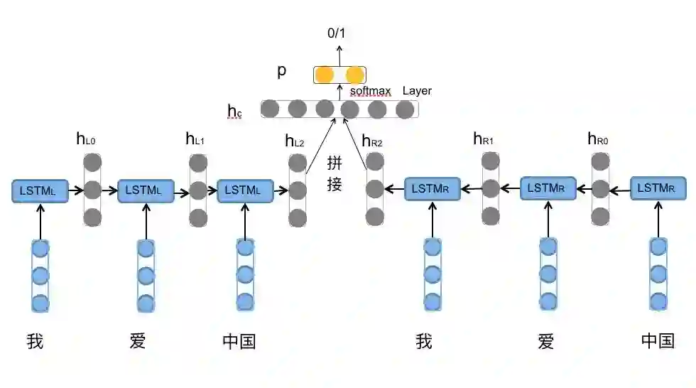 但是利用LSTM对句子进行建模还存在一个问题:无法编码从后到前的信息。在更细粒度的分类时,如对于强程度的褒义、弱程度的褒义、中性、弱程度的贬义、强程度的贬义的五分类任务需要注意情感词、程度词、否定词之间的交互。举一个例子,“这个餐厅脏得不行,没有隔壁好”,这里的“不行”是对“脏”的程度的一种修饰,通过BiLSTM可以更好的捕捉双向的语义依赖。