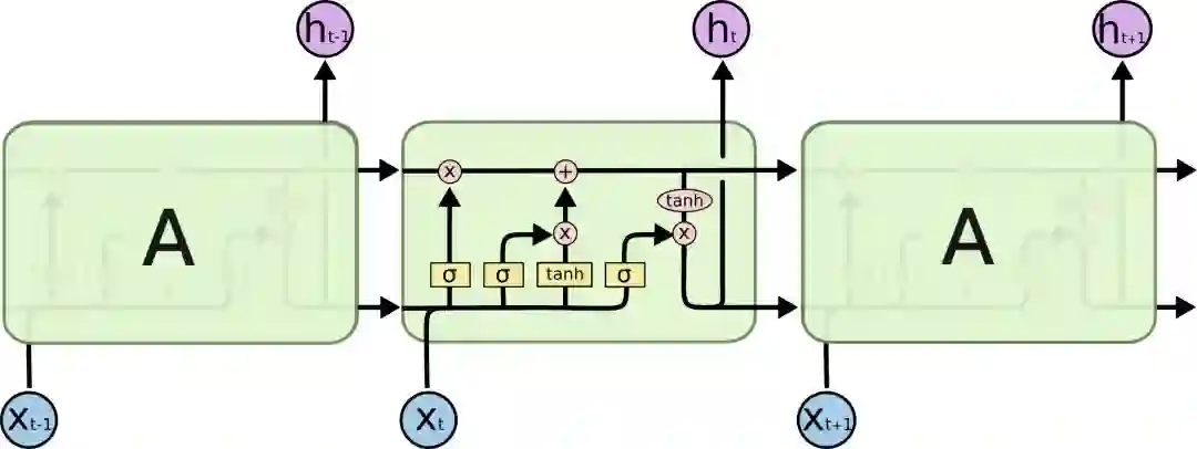 组成。LSTM的计算过程可以概括为,通过对细胞状态中信息遗忘和记忆新的信息使得对后续时刻计算有用的信息得以传递,而无用的信息被丢弃,并在每个时间步都会输出隐层状态