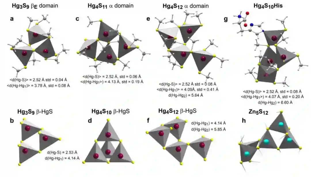 研究结果发现,在植物叶片中大部分汞以 Hg[(SR)2+N/O0-2] 的化学形态存在,部分汞以纳米颗粒态汞(HgxSy)的形态存在(图1)。通过二阶 Møller-Plesset 振动理论,利用计算机模拟了 HgxSy 的几何结构(图2)。本结果首次揭示了植物叶片可以将单质汞转化为惰性的纳米状硫化汞,这对深入了解叶片中汞的再挥发、毒性以及其进入土壤后的转化提供了基础理论知识,丰富了汞的生物地球循环理论。成果发表于环境科学领域期刊 Environ. Sci. Technol。