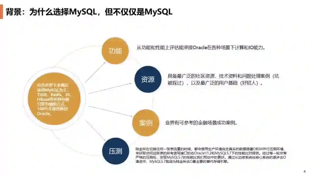 首先,选择的数据库要从功能和性能上能够承接 Oracle 在各种场景下计算和 IO 能力。其次,它还要具备最广泛的社区资源、技术资料和问题处理案例,通俗的说就是大量坑被踩过,以及最广泛的用户基础,外面招开发和运维工程师都比较好招。然后,还要在业界有可参考的金融场景案例。这一点相信大家都很熟悉,阿里和腾讯在金融场景上已经有不少成功的案例。