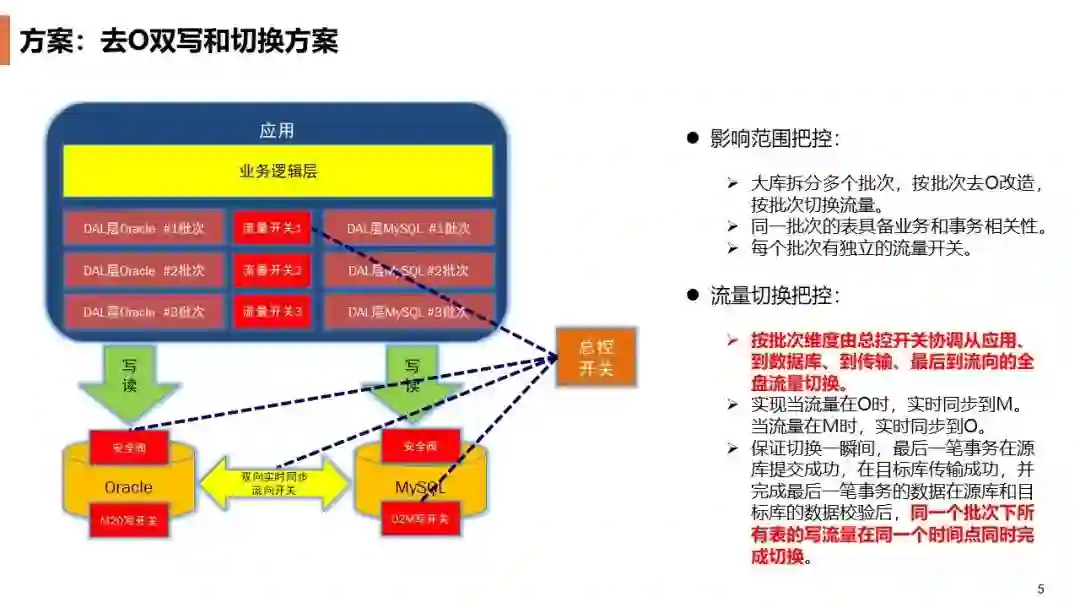 在这个过程中,从第 1 张表从 Oracle 切换到 MySQL,到最后一张表关闭 Oracle 流量,在非常长的一段时间内,整个应用是由 Oracle 和 MySQL 在同时提供服务。其中某些表已经完成去 O,读写的流量在 MySQL 上,由 MySQL 同步到 Oracle,部分表还未完成去 O,读写流量在 Oracle 上,由 Oracle 同步至 MySQL。这就非常考验运维的能力,要确保在这个架构下每天高频的各种发版和数据库变更都非常准确。