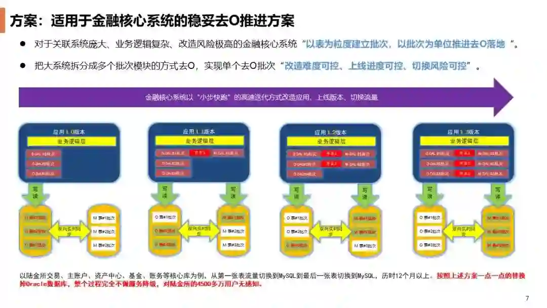 从图中大家可以看到一个庞大的金融核心系统去 O 改造中,应用改造、上线版本和流量切换这 3 件事情实在并行落地的。