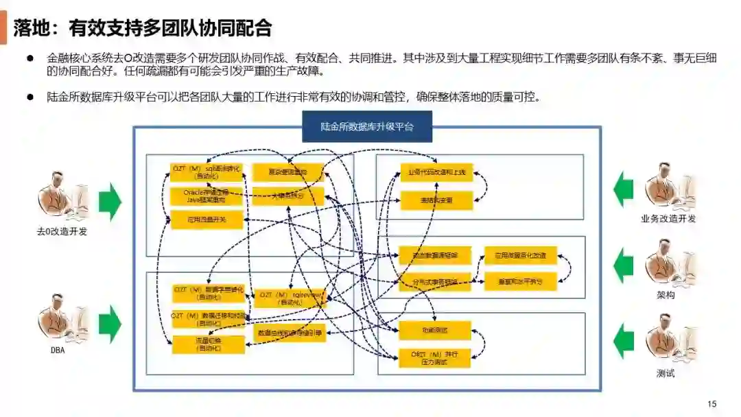 除了确保各种规则精准落地外,金融核心系统去 O 改造需要多个研发团队协同作战、有效配合、共同推进。其中涉及到大量工程实现细节工作需要多团队有条不紊、事无巨细的协同配合好。任何疏漏都有可能会引发严重的生产故障。
