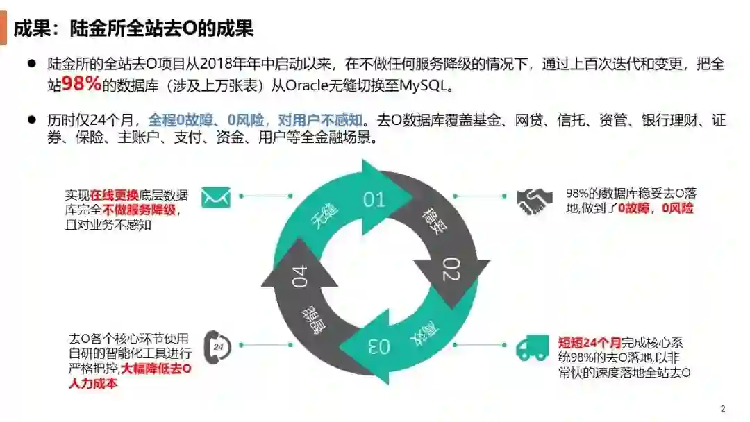 陆金所从 2018 年启动全站去 O 项目以来,在不做任何服务降级的情况下,历时 2 年通过上百次变更,把全站 98% 的 Oracle 数据库无缝切换到 MySQL 上。其中,这 98% 的数据库覆盖了陆金所的账务、资金、资产中心、支付、交易、用户、基金、主账户、网贷、资管、银行理财等全金融场景。整个去 O 的全程 0 故障、0 风险、对用户几乎不感知。