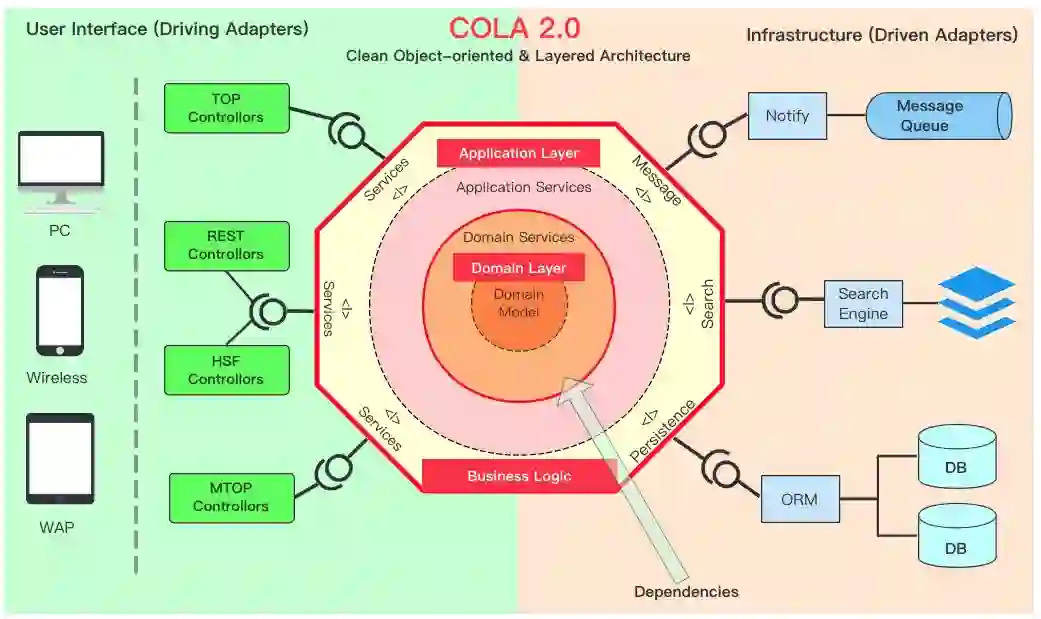 一方面 COLA 是一种架构思想,是整合了洋葱圈架构、适配器架构、DDD、整洁架构、TMF 等架构思想的一种应用架构。