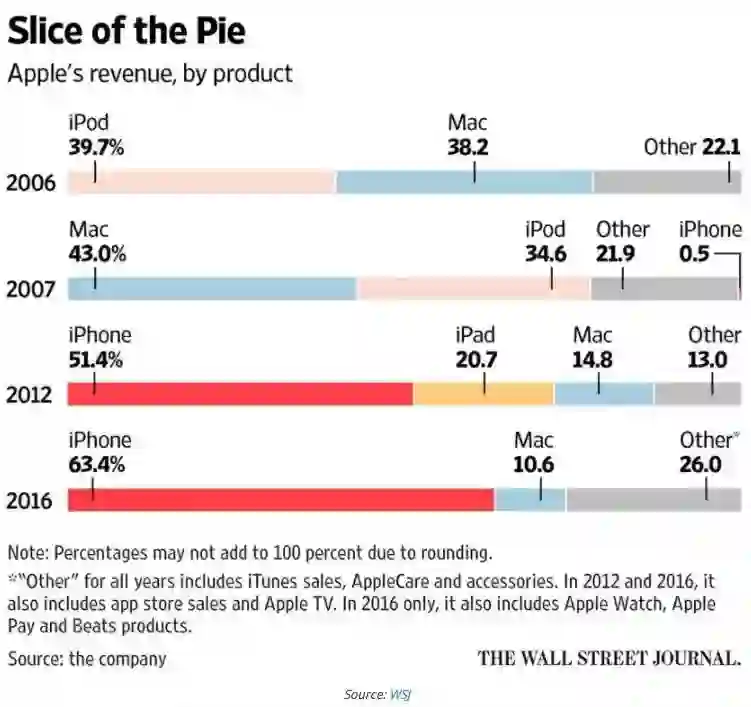 最近几年,iPhone销量疲软,苹果收入有从硬变软的趋势,应用和其他增值服务收入逐年攀升,已经成为苹果第二大营收来源。2008年,苹果推出了App Store,自此以来,靠卖应用,苹果已经获得了约1000亿美元的营收,笼络了全球1600万开发者。苹果从每个应用的销售中抽成30%,最近还开始向开发者收取99美元一年的年费。