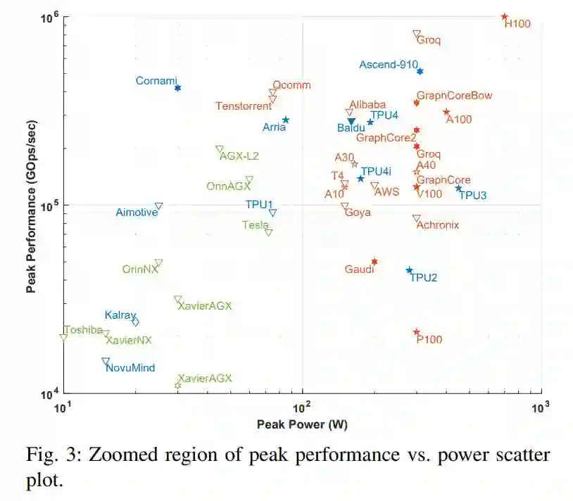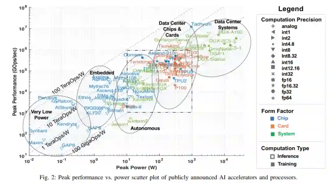 图中 x 轴表示峰值功率,y 轴表示每秒峰值千兆操作数(GOps/s),均为对数尺度。处理能力的计算精度用不同几何形状表示,计算精度范围从 int1 到 int32、从 fp16 到 fp64。显示的精度有两种类型,左边代表乘法运算的精度,右边代表累加 / 加运算的精度(如 fp16.32 表示 fp16 乘法和 fp32 累加 / 加)。使用颜色和形状区分不同类型系统和峰值功率。蓝色表示单芯片;橙色表示卡;绿色表示整体系统(单节点桌面和服务器系统)。此次调查仅限于单主板、单内存系统。图中空心几何图形是仅进行推理加速器的最高性能,而实心几何图形代表执行训练和推理的加速器的性能。